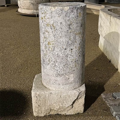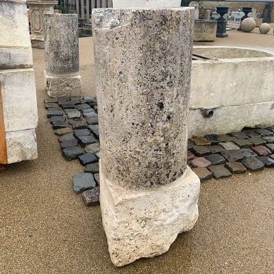 BCA Ref 2023101 - This heavyweight pair of antique French limestone posts look very like quayside bollards, but this pair wasn’t used for that. They would have been strategically and decoratively placed flanking an entranceway, thereby guiding horse-drawn carriages in the right direction. The cylindrical upper part was visible above ground level, whereas the rustic base served as the foundation embedded below ground. They are no newer than 19th century, and are unmistakably Truly Reclaimed.