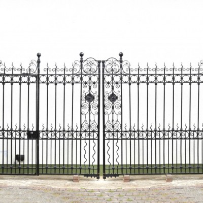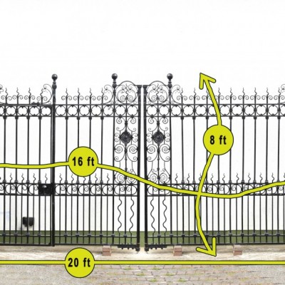 The overall entrance including the cast iron pillars is 20 foot wide (6100mm). The pillars themselves are 10 foot 6 inches high (3200mm). A walk through wicket gate is incorporated into one of the two gate sections. Each gate section measures 8 foot by 8 foot (2440mm x 2440mm).