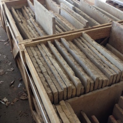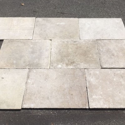 Genuine Antique Barr de Montpellier limestone. The fairly regular size of these very rare flagstones permits laying format in regular coursed bands, width mostly 53cm but others such as 52cm, 51cm too (20 - 21 inches), which is a sign of authenticity. Lengths are fairly regular too at mostly just over 70cm. Thickness is a fairly regular 3cm (just over 1 inch).