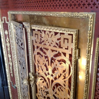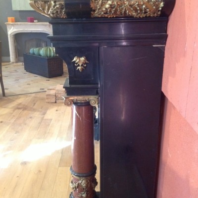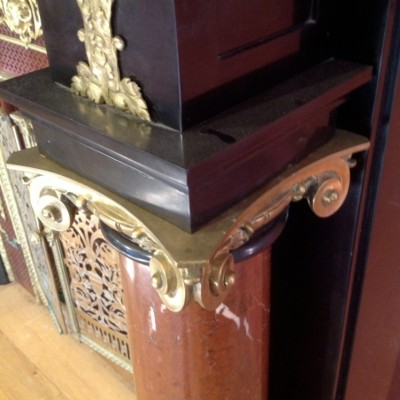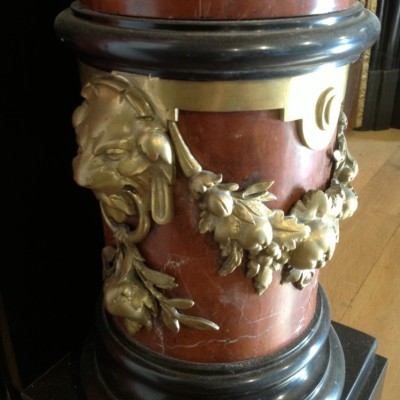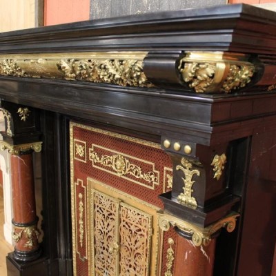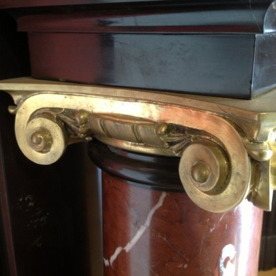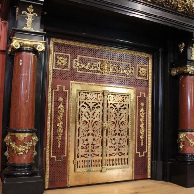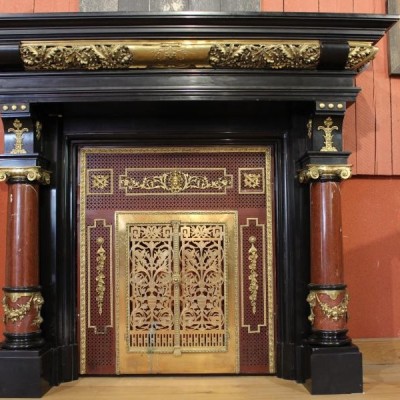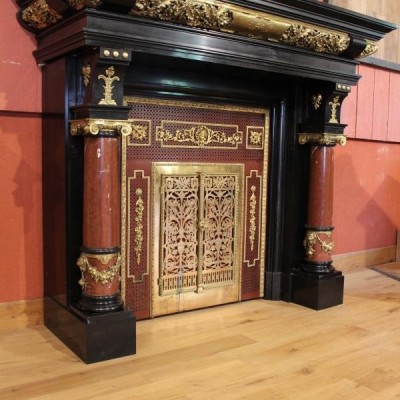 BCA ref 01312 : Exceptional antique French fireplace in Empire style, from the early 1800s. In black and red marble, featuring columns, lintel with bronze mouldings of oak foliage and acorns. The column's bases feature lions' heads and bronze garlands of fruit. There are twin bronze doors. Dimensions approx: overall width 178cm (70 inches) x ht 149cm (59 inches). Front-to-back 69cm (27 inches). Firebox size 91cm x 106cm (36 x 42 inches). Export document supplied.