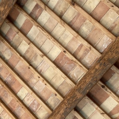 BCA ref 02036 : Antique reclaimed parefeuille tiles, light tones in yellow, beige, & salmon tones (pink & ochre).