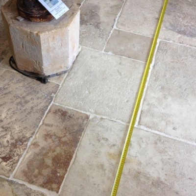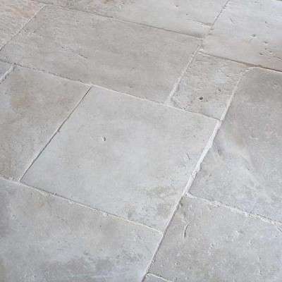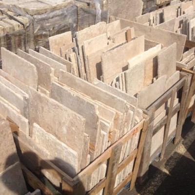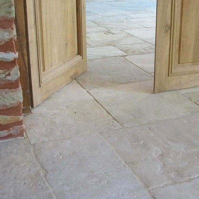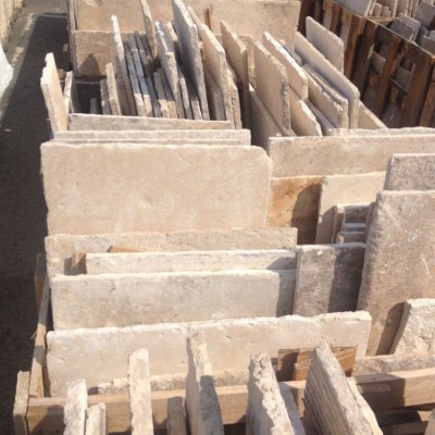 BCA ref 10096 : Reclaimed antique limestone floors, random but large average size flagstones with excellent original surface. These are genuine antique flagstones "top cut" to fairly regular thickness of 3cm (1.2" approx.), or 2cm (0.8 inch) approx. to order. In stock now. Also available at full thickness, see ref 00096. BCA have a 20 year track record exporting antique materials worldwide.