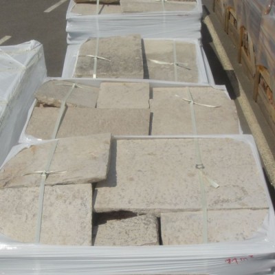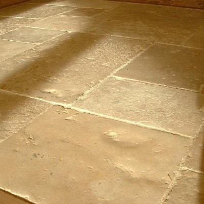 BCA ref 00096 : Genuine antique limestone paving, authentic reclaimed flagstones, ancient stones with original worn exquisite surface patina. Mixed sizes - large format. Full thickness from 8cm to 12cm ( 3" to 5" ). Also stocked sawn to 3cm approx. ( 1.25" ) thickness to facilitate interior flooring (see ref 10096), and at 2cm (0.8 inch) possible to order. Antique reclaimed Dalle de Bourgogne limestone floors in random format. Salvaged stone paving, tile, flooring slabs. Salvage antique limestone flagstones