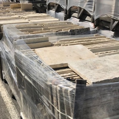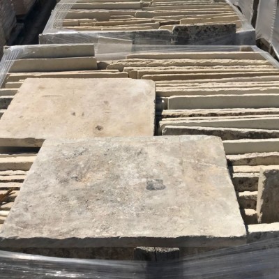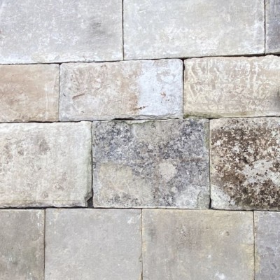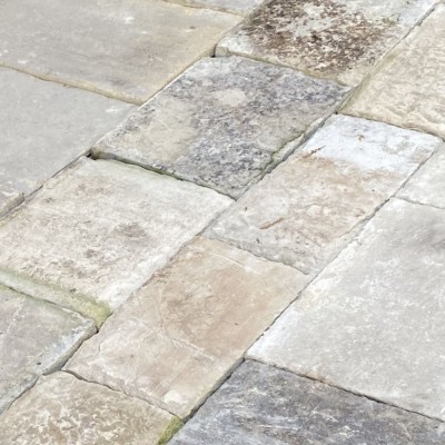 BCA ref 49289: Antique reclaimed Bar de Provence limestone flagstones in smaller format than Bar de Montpellier, and more "blond" in colour. Salvaged "as is" with its weathered patina, but can be cleaned on site using the usual specialist stone cleaners, particularly if required for interior use (see 1st photo, cleaned). Dimensions approx. : band width mostly 39cm (15.3 inches) x thickness 6cm (over 2 inches) approx.