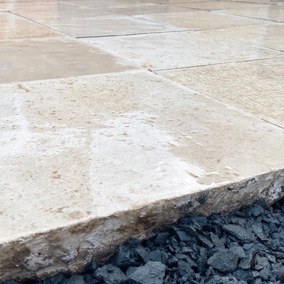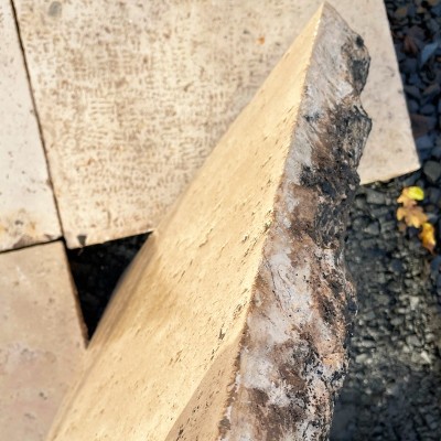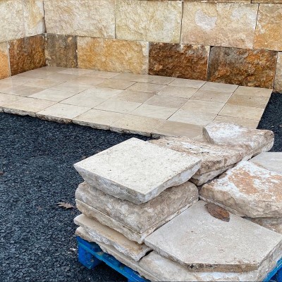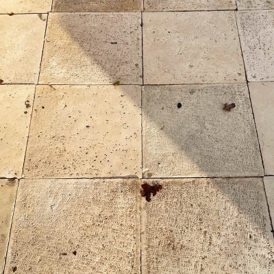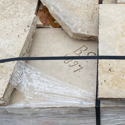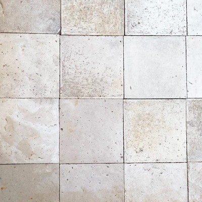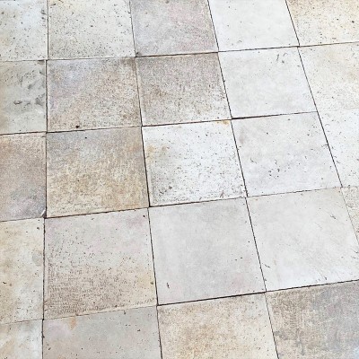 BCA Ref 2021103: This antique Bourgogne type limestone floor has an exceptional authentic worn patina. One of the pieces has the date 1897 carved into it (see photo). The stone tile size is 40cm x 40cm (15.75 x 15.75 inches). This antique stone floor can be re-installed either inside or outside.