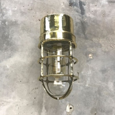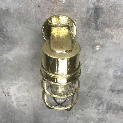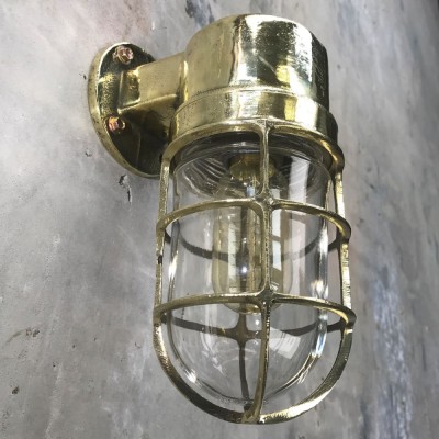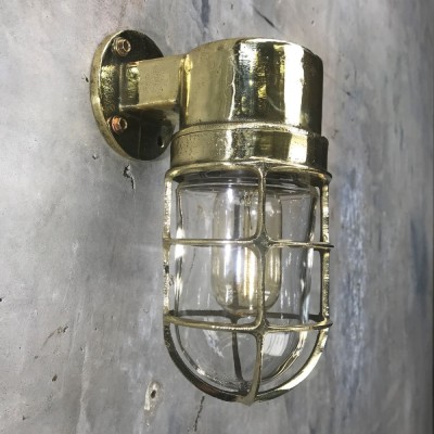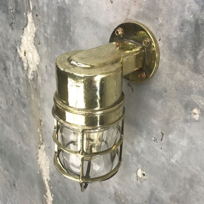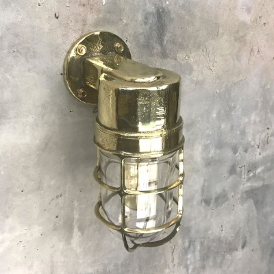 A reclaimed industrial cast brass 90 degree outdoor wall cage light. Robust lighting to use outdoors for porch way lighting, front door or back door illumination. But equally use indoors to inject some industrial character and authenticity.
