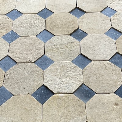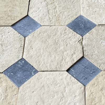 BCA ref 202267: Antique limestone with cabochon floors, with historic authentic projects in mind which is difficult to source in decent quantities, this is why we have adapted our major stock ref 201456 reclaimed antique limestone squares to an octagon format and combined them with our aged black marble corner squares (cabochons). The result is stunning - We have large quantities available. Thickness is approximate.