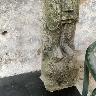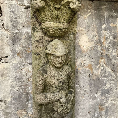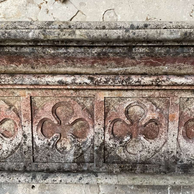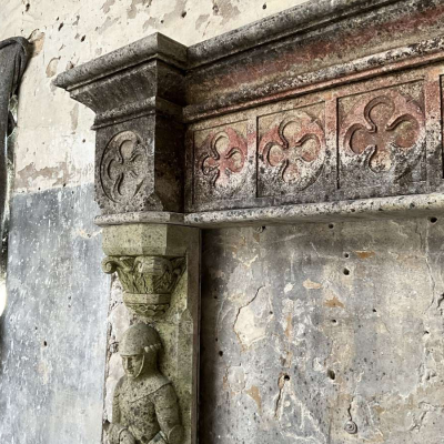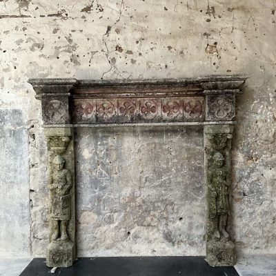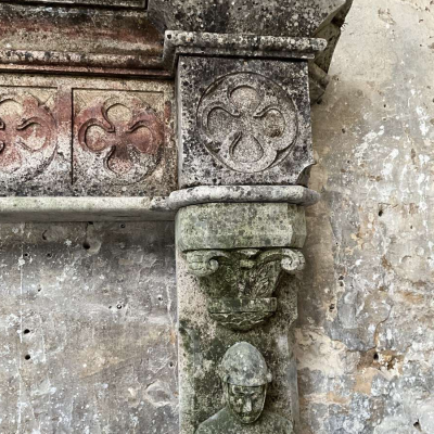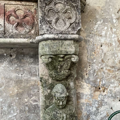 A large reclaimed carved stone Gothic Revival fire surround overall size 176cm wide x 155cm tall.