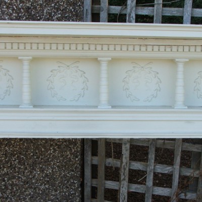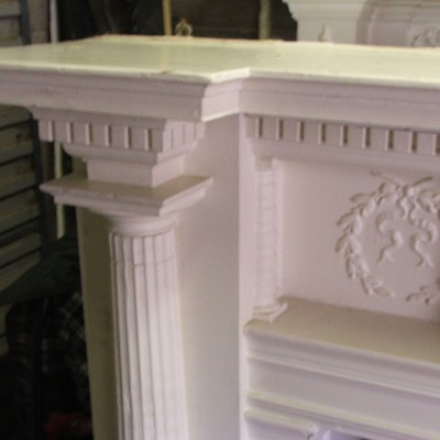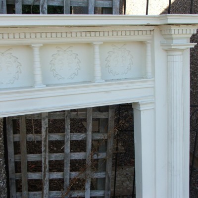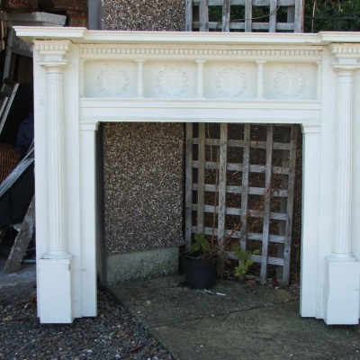 This impressive painted neo-classical chimneypiece is in vg condition. Fluted columns surmounted by Doric capitals. Substantial moulded breakfront shelf with frieze showing wreaths fronted by mini columns. Overall this is an grand architectural piece.