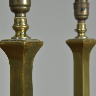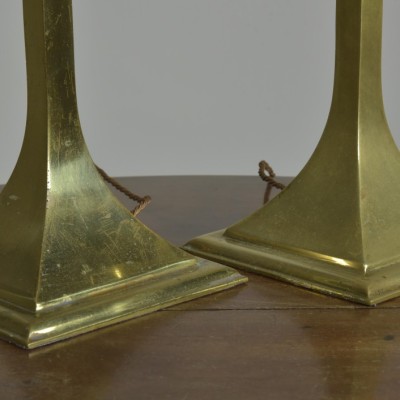 An antique pair of cast brass table lamps with square shafts and spreading concave pyramidal bases. English, approx. 1920s-30s.