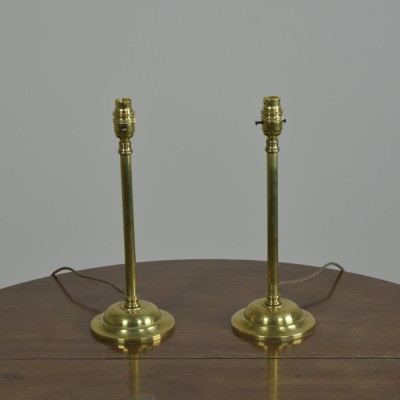An antique pair of plain stemmed brass GEC table lamps with decorative collars and circular (cast iron weighted) bases. English pre mid century.