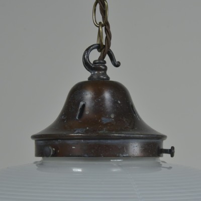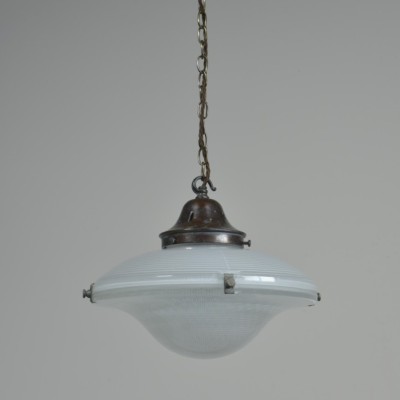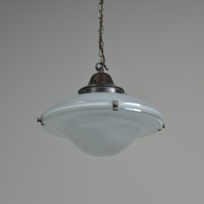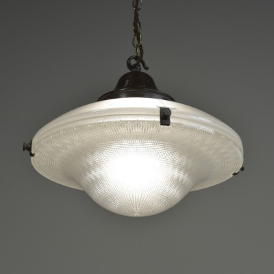 An antique Holophane "flying saucer" pendant light, the two very crisply moulded prismatic glass pieces (satin etched to the inside) held together with four clips, complete with antique / original gallery and hook. In excellent condition. English c1920. Glass pieces all marked HOLOPHANE etc as usual with antique pieces.