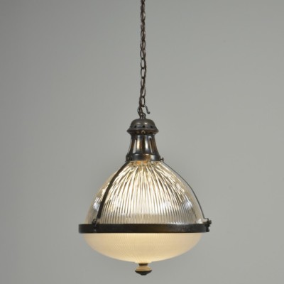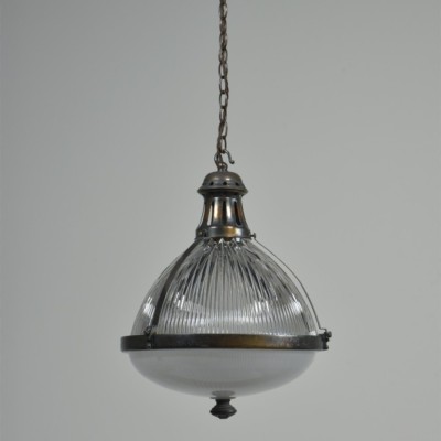 A large antique Holophane globe / lantern pendant light with 2 piece prismatic glass body, original patinated gallery / hook / mounts and finial. English, early 20th century.