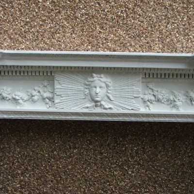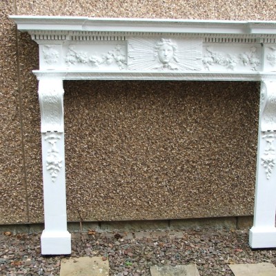 A rare painted 19th Century George II style pine chimneypiece of impressive scale in the manner of William Kent. The frieze is centred by a plaque with a mask of Apollo surrounded by a sunburst. Fruit and flower swags either side of centred plaque. Large carved corbel supports, topped with urns. Dimensions: Width across top 67.5ins. Height 54 ins. Internal 46ins w. x 40ins h.