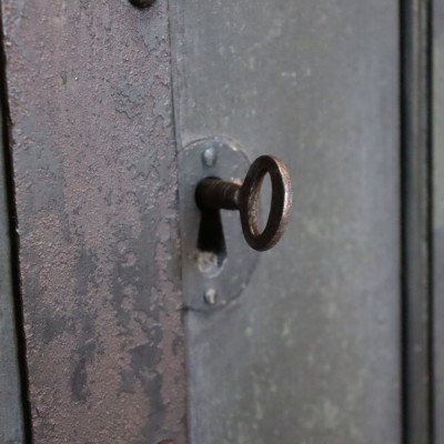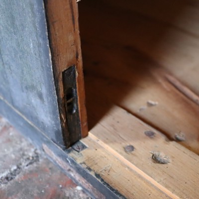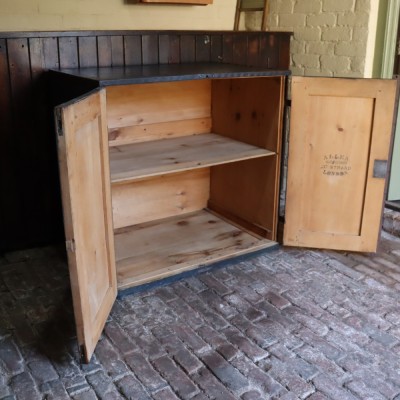 A rare painted pine carriage case made by one of the top London Makers. In as found condition, the lettering all original and untouched, the chest complete with working key and pull-out central shelf. The doors fitted with a top and bottom brass slip locks, with a main front lock for personal security, plus there are two threaded holes top and bottom of the case which align with the securing metal strap that would have received two threaded bolts for safe stowage.