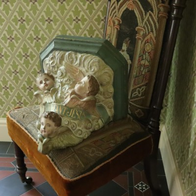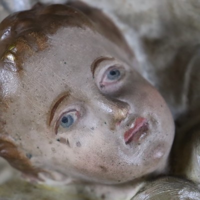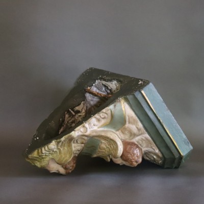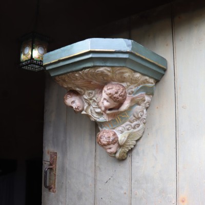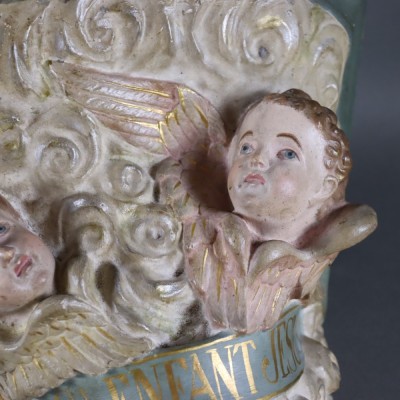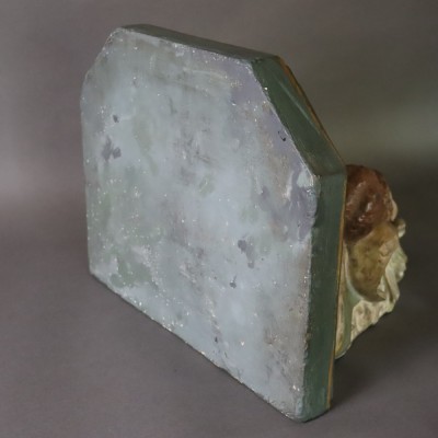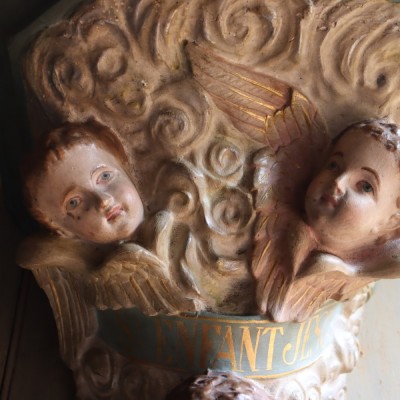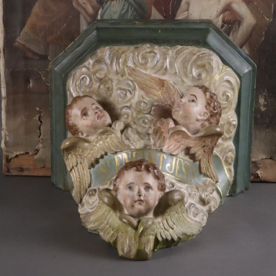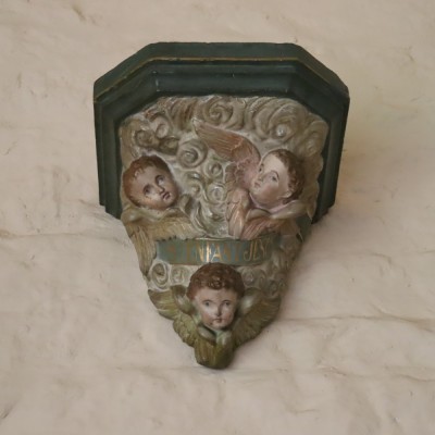 Retaining its original painted finish with the inscription “St INFANT JESUS” in gilt lettering, with three winged putti modelled amongst swirling clouds. The robust and broad surface area making it ideal for displaying quite large religious artifacts or for an architectural faux support bracket. Circa 1875