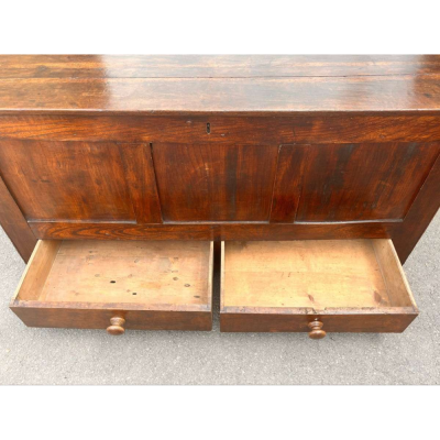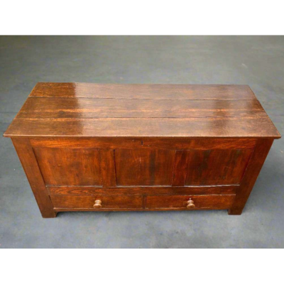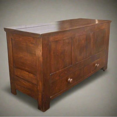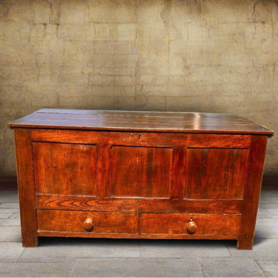 This substantial antique oak mule chest showcases exquisite panelled craftsmanship, reflecting skilled woodworking from a bygone era. The lift-up lid opens to reveal a spacious compartment ideal for storing bulky items, while the two drawers at the base provide additional organized storage. Its rich, aged patina not only highlights the natural beauty of the oak but also adds character and authenticity, making it a distinguished focal point in any room. Combining both aesthetic charm and functional design, this chest offers a timeless storage solution for collectors and interior enthusiasts alike.