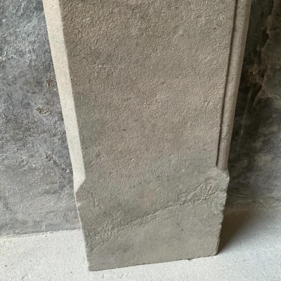 A 19th Century antique English stone fire surround with great wear. Overall width 126cm x overall height 115cm. Opening 82cm wide x 92cm tall. Depth 7cm.