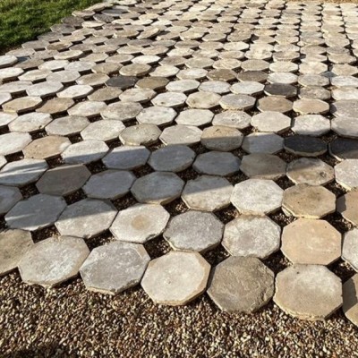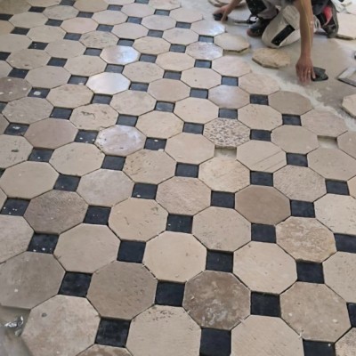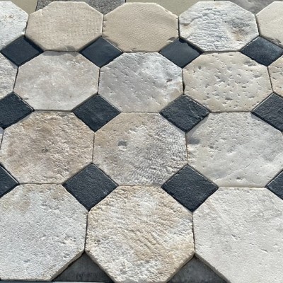 Reclaimed Cabochon flooring, Authentic French Surface from 17th century, octagonal limestone flooring, available for international delivery, the best stocks in the world, reclaimed Bourgogne limestone in black Cabochon flooring,