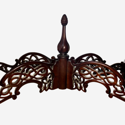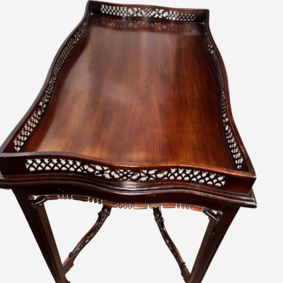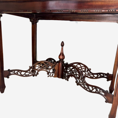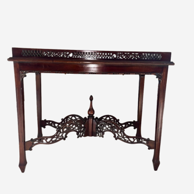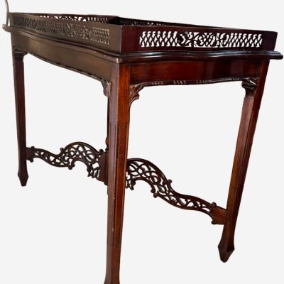 This is a Vintage mahogany ornate galleried table used to display silver. The table has been made in a Chippendale fashion with its beautiful pierced fretwork stretcher rails to connect each leg.