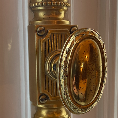 The brass/bronze fittings of many of the casement windows include a (presumed) gilt crémone bolt (similar to espagnolettes) and hinges. One of the bolts was removed which showed that the back was stamped 'H E L Fontaine, Rue de Fauborg St Honoré, Paris'. Maison Fontaine, formerly located on rue de Faubourg Saint-Honoré in Paris, is one of France’s oldest makers of decorative brass window furniture and architectural hardware, with roots dating back to 1740. The company was founded by M. Lavollée and later taken over by Francis and Joseph Fontaine in 1842, when it adopted the Fontaine name. Known for its artisanal brass and bronze work, Maison Fontaine decorated many notable Parisian buildings and palaces, and their founders were key figures in establishing the firm’s reputation for quality window and door fittings.