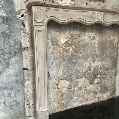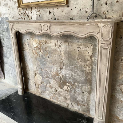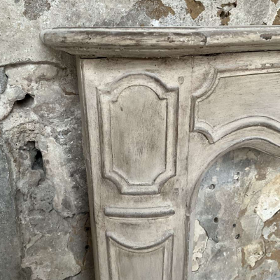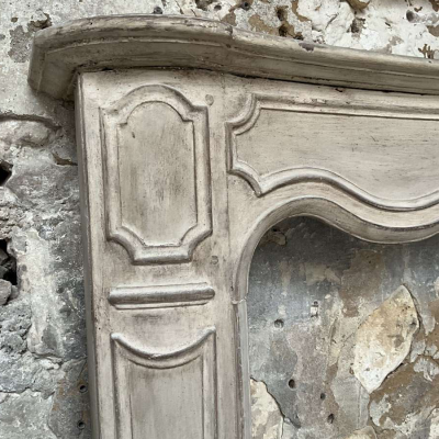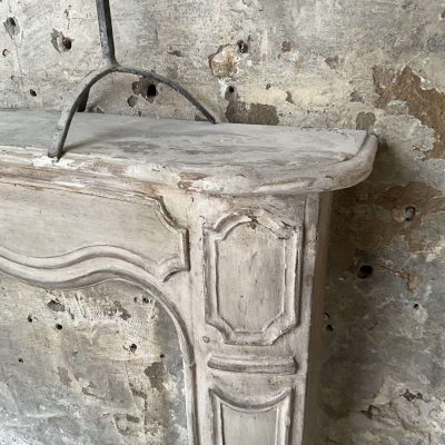 18th Century wood fire surround from the Louis XIV period in it’s original paint. Overall size 168cm wide x 129cm tall. Opening 133cm wide x 112cm tall. Depth of shelf 21cm. Good original condition with old repair to the right hand corner.