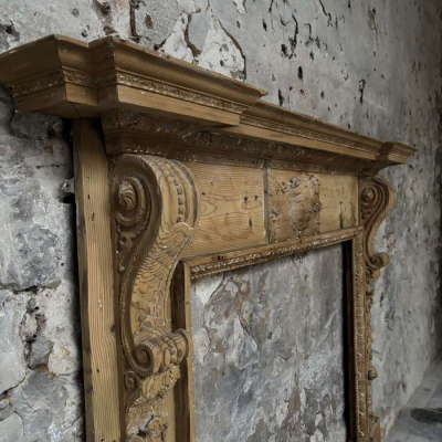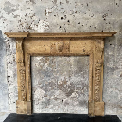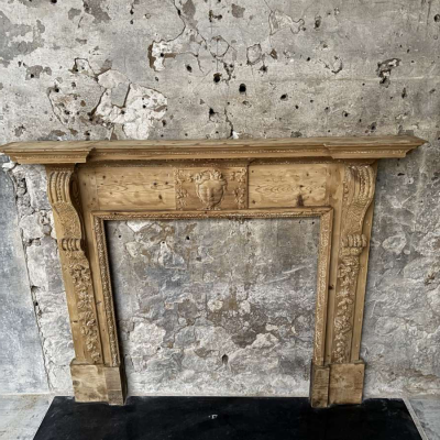 A 19th Century English carved pine fireplace in the Georgian style. Overall size 160cm wide x 128cm tall, opening 91cm wide x 94cm tall, depth of mantle 20cm. Good original condition with traces of old paint, a couple of small losses and later footblocks. Uk and export delivery available. For more info email [email protected] or WhatsApp 0044 (0)7974 579694