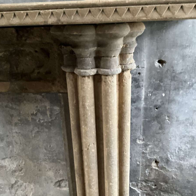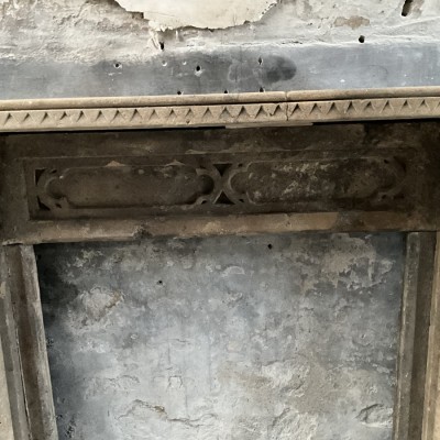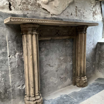 A restored period 19th Century Bath stone Gothic Revival fire-surround with beautiful original wear, colour and patina. Overall width 177cm x overall height 130cm, opening width 81cm x opening height 99cm, depth of mantleshelf 27cm.