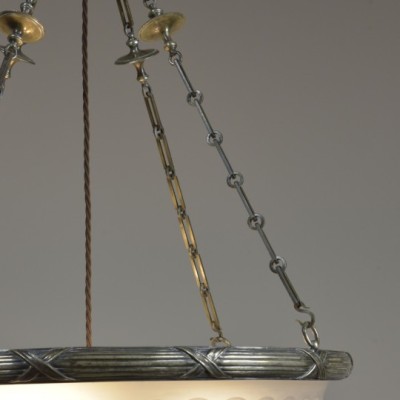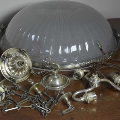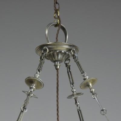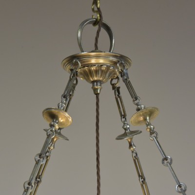 Complete with all the original matching parts one could hope for; chains, decorative "hanger" with large loop, hooked ceiling plate (supplied with slotted head screws) and the 3 armed lampholder mount (all original silver plated brass including the three Bc lampholders).