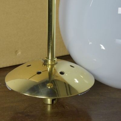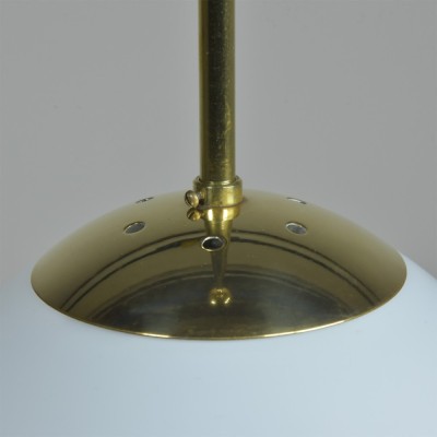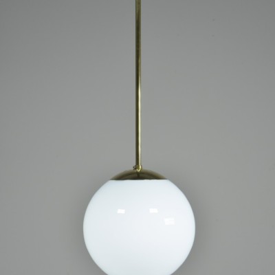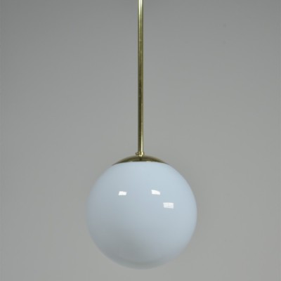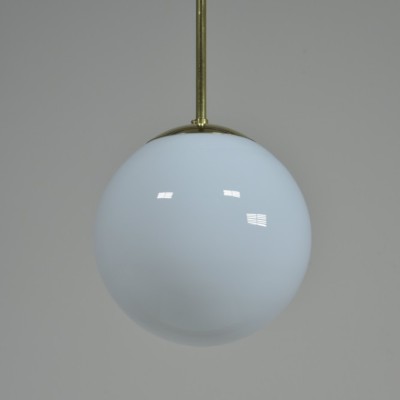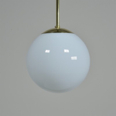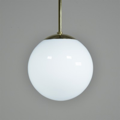 A set of 4 antique opal glass globe lights with brass monks cap mounts, hanging stems and ball and socked ceiling plates and brass covers.
