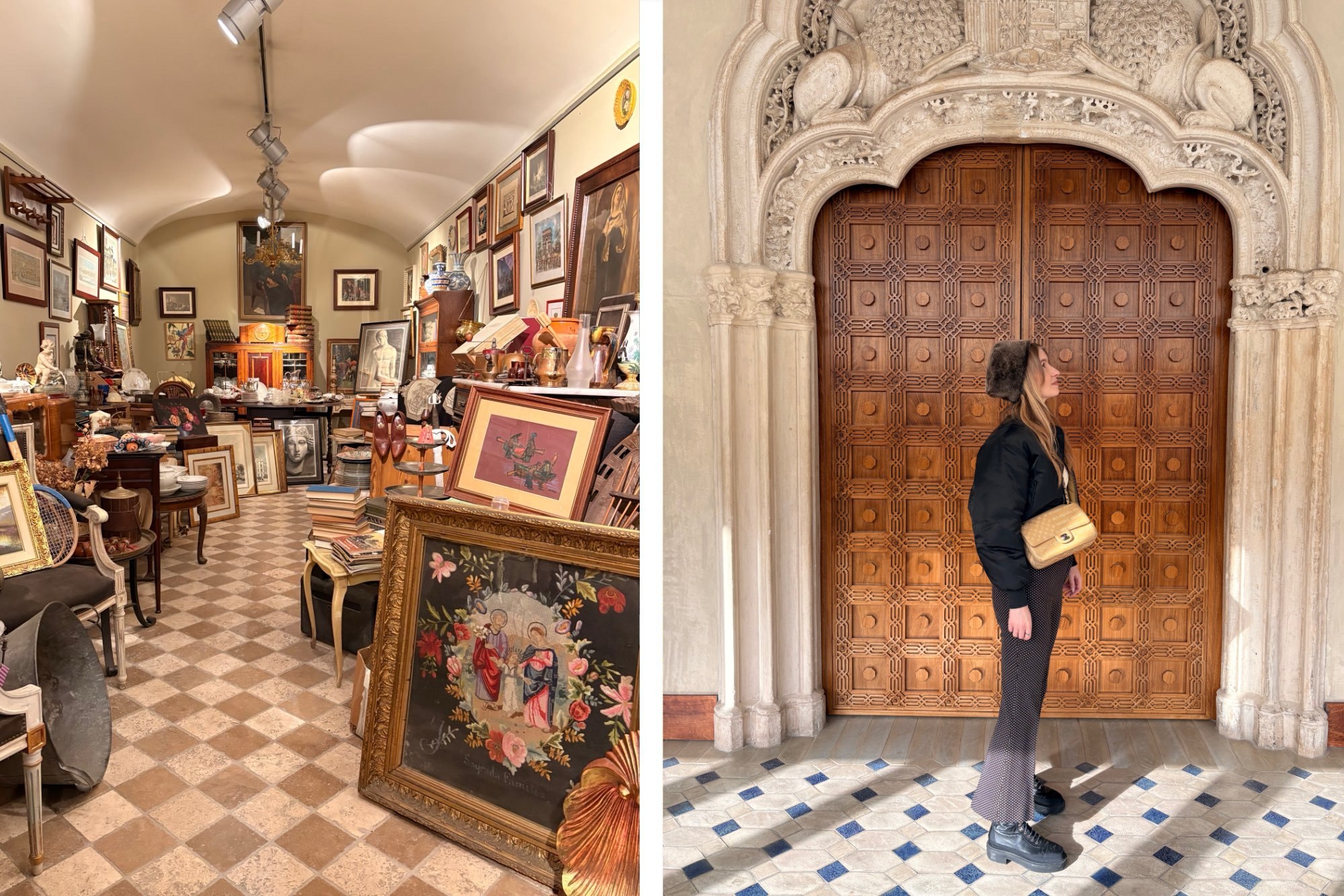 The first vintage Spanish plate I found also has a connection to the palace. Ana Lacoma was an antiques shop on my list of places to visit, but having neglected my map while enjoying our first venture out in daylight, we discovered Ana’s shop the old-fashioned way—drawn in by her window display en route to the palace. Thanks to my husband’s basic grasp of Spanish and Google Translate, we chatted with Ana and learnt that she had acquired and restored an old bunker from the 1808 War of Independence that connected to the Aljafería Palace. Once used to defend against Napoleon’s sieges, the space is now decorated with antiques, paintings, and curiosities, having been transformed into her shop, restoration workshop, and interior design studio.