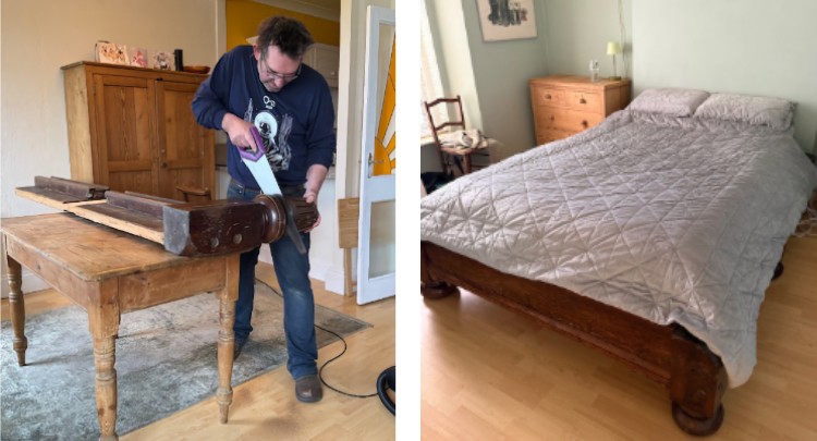 The finished bed makes full use of the original table’s craftsmanship, with its thick rails and distinctive turned feet giving it a presence entirely fitting for its new role. What began as a resourceful solution to an unexpected problem has resulted in a piece of furniture with real character and longevity.